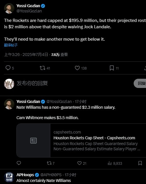 美媒APHoops则回复写道:“几乎可以肯定火箭队将选择裁掉内威。”