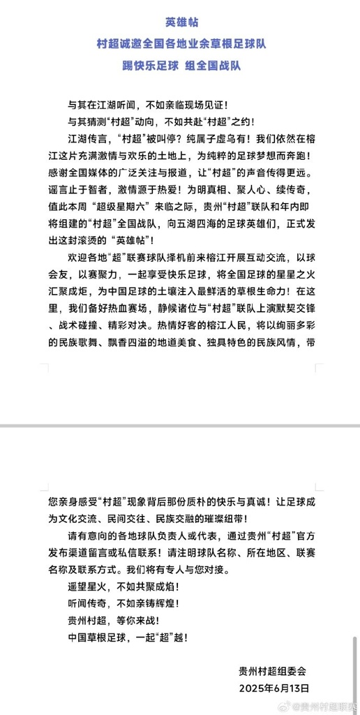 谣言止于智者,激情源于热爱!为明真相、聚人心、续传奇,值此本周“超级星期六”来临之际,贵州“村超”联队和年内即将组建的“村超”全国战队,向五湖四海的足球英雄们,正式发出这封滚烫的“英雄帖”!