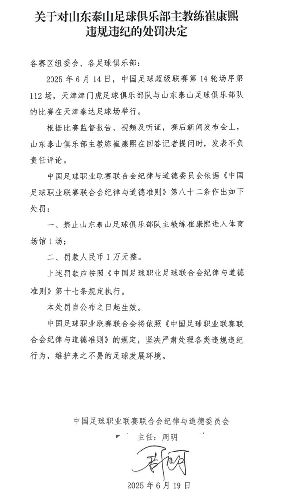 06月19日讯 中足联官方消息,泰山主帅崔康熙在津门虎vs泰山赛后发布会上发表不负责任评论,禁止他进入体育场馆1场,罚款1万元。