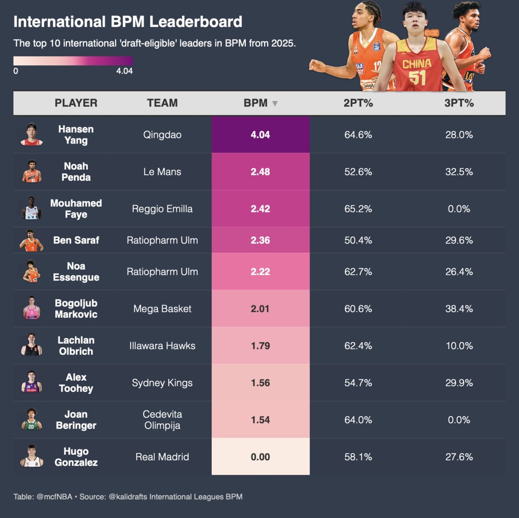 06月10日讯 NBA选秀分析师Mohamed晒出了2025年NBA国际新秀(法甲、德甲、CBA等联赛)的BPM榜单,中国男篮新星、青岛队中锋杨瀚森以4.04高居第一且优势明显,排名第二的是法国球员诺厄-庞达(2.48)。