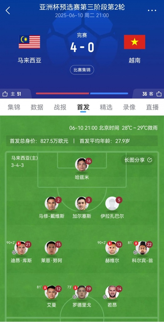 在2025年6月10日的亚洲杯预选赛比赛中,马来西亚主场4-0大胜越南,这场比赛多名马来西亚归化球员登场亮相。目前FIFA官方并未决定本场比赛是否判负,而这场比赛关系到马来西亚和越南是否能够参加亚洲杯正赛。